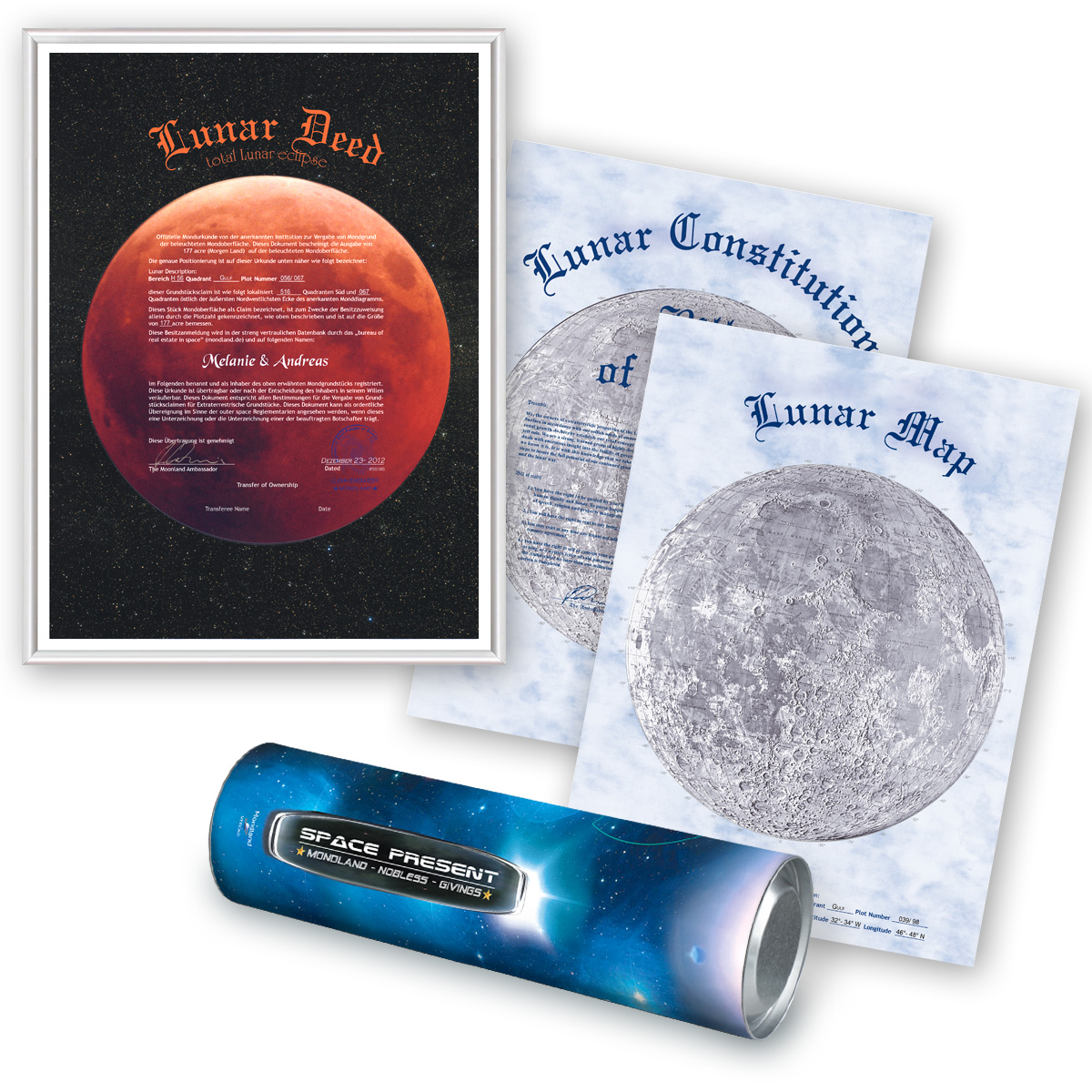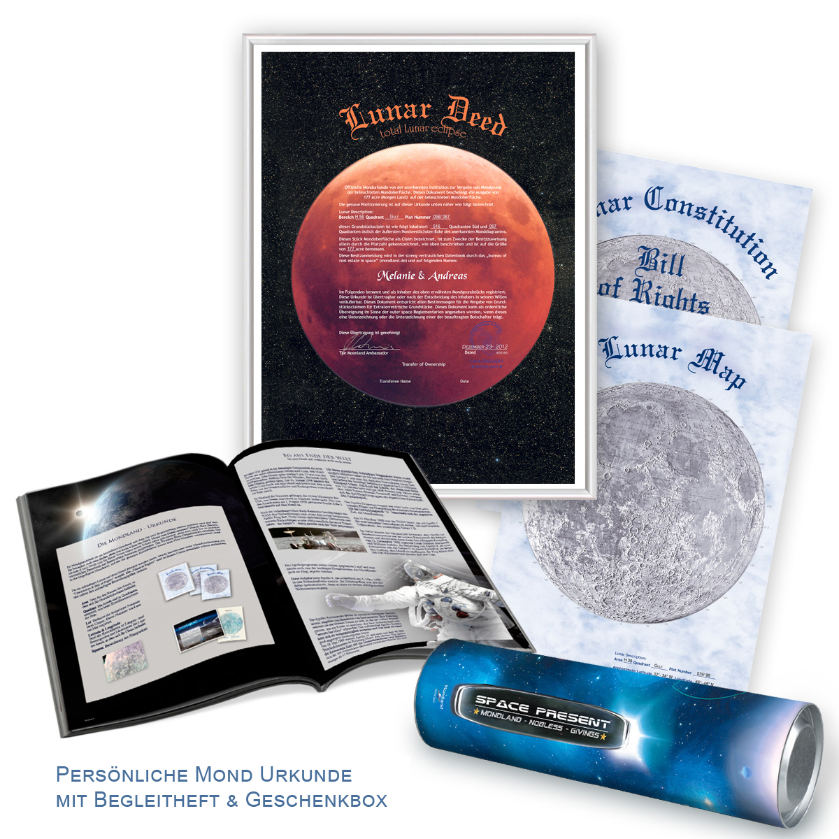 Dieses elementare Ereignis haben wir in dieser Mondland Sonderedition festgehalten. Diese Ausführung der Besitzurkunde unseres Mondgrundstücks eignet sich besonders gut als romantisches Geschenk für das gemeinsame Plätzchen auf dem Mond. Sichern Sie sich ein Grundstück auf dem Mond als wertiges Sammlerobjekt in der Edition Mondfinsternis.