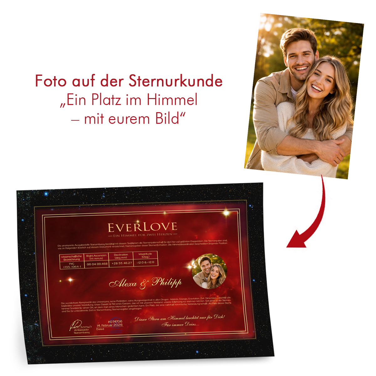Die Urkunde wird mit euren Namen und eurer persönlichen Widmung gestaltet. Auf Wunsch kann auch ein Foto hinzugefügt werden, für ein noch persönlicheres Andenken. Das Datum der Sterntaufe wird auf euren besonderen Tag gelegt – so wird euer Moment für die Ewigkeit festgehalten.